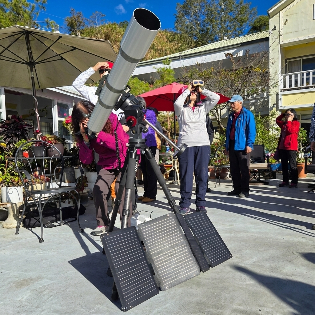 這次跟著老師參加太陽觀測活動, 現場架起專業望遠鏡,準備觀測太陽黑子與日珥。 對外行人來說,最吸睛的是器材; 對實際操作的人來說,最關鍵的卻是——電力是否穩定。戶外場地沒有固定插座, 一旦設備在觀測過程中斷電, 不只錯過畫面,也會中斷整個流程。 因此在望遠鏡架設完成後,我們同步接上太陽能板與小電寶行動電源, 直接利用現場充足的日照補電。太陽在天上被觀測, 太陽在地面轉換成電力, 設備運作一路穩定,觀測也順利進行。 這次經驗再次提醒我們: 好的戶外體驗,除了專業設備,更需要事前準備好的能源方案。當電力不是變數, 才能把注意力真正放在眼前的風景與探索上。 若活動時間較長,建議搭配太陽能板與行動電源同步使用,能有效降低臨時斷電的風險。